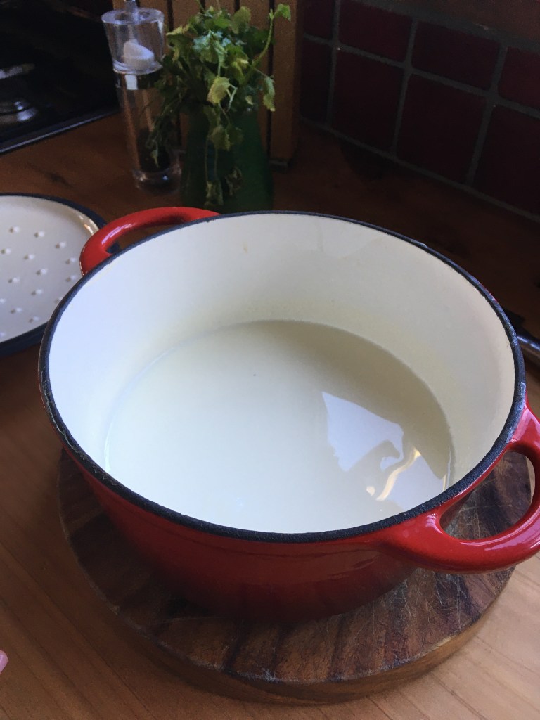 I made it in a dutch oven. I didn’t have a thermometer, so I wasn’t entirely sure what the milk temperatures were. I tried to bring it to near boiling and turned off the heat just before it started boiling. And I cooled it down so it wasn’t burning my finger and tongue when tried it. I also just put it in the oven, the dutch oven wrapped in a towel. I didn’t turn on the oven light as suggested in the recipe, however my oven was still cooling down from the bread baking exercise just before. The yoghurt I used was a plain greek yoghurt. On a label it said that it has some live cultures in it, so I was hoping it will work.