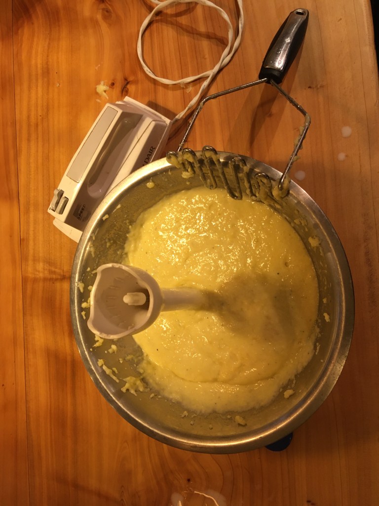 I did exactly what my mum said. However, for some reason she forgot to mention that mashing cold potato is not as easy as it seems at first glance. First I tried with a mixer. No good! The handles got stuck at the first go. So I took out a stick mixer. Same story. Then I took that hand-held mashing thingy and finally made some progress. However, I still didn’t come far. The potato was sticking to everything! I decided to add some milk, like I would do mashed potato. That kind of helped a bit (although both mixers were still useless). My arm was sore, I was angry and fed-up and frustrated and... Somehow I got through and mashed that damn potato as much as I could. The end result looked rather terrible…